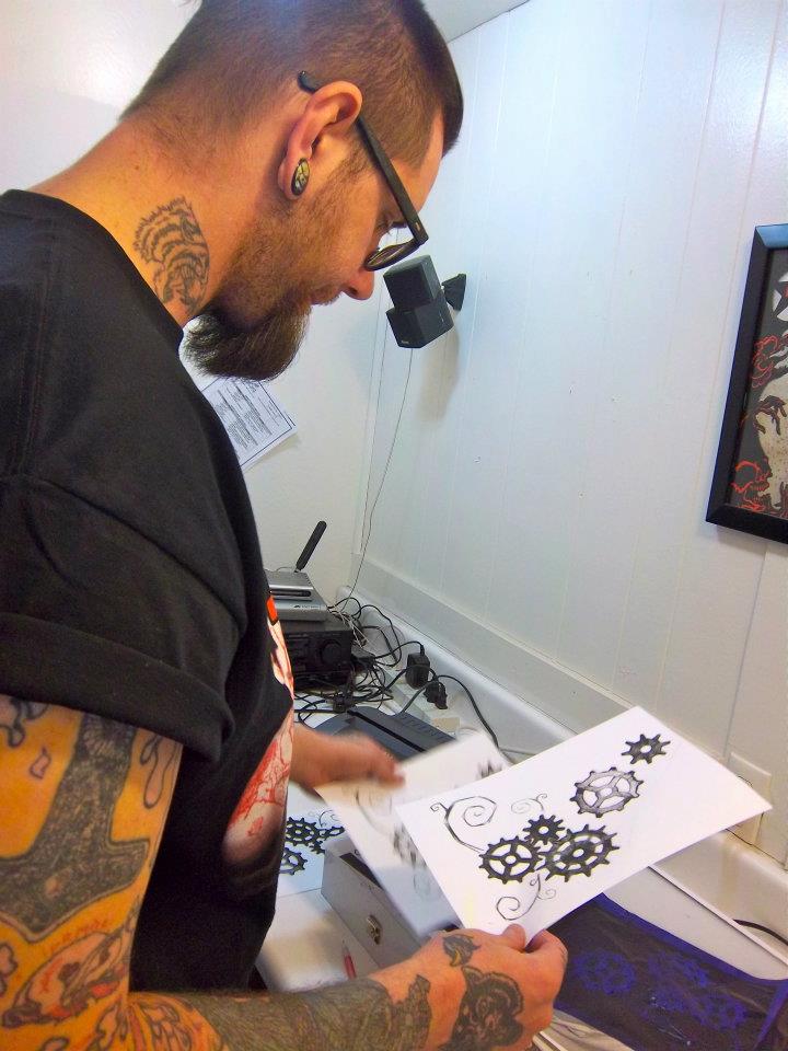 The bell jingles, the door opens and my nose catches whiffs of sterile fluids. It’s lunchtime and the tattoo artists are cleaning, sharpening, sterilizing their equipment, and setting up their stations. Long strands of light poured onto the wooden floors. Clutch is droning on in the background with its revolving, methodic beat. The tattoo machines were freshly cleaned and steel parts steamed from inside packaged, sterile bags. There is a couch in the main room, a cold, black leather couch upon which I place my things beside carefully beside me. I am early. I sat for a few minutes on the the couch before Rob’s 6’5 figure came over and hovered over me. He asked me about my day. My attention is drawn to his black combat boots and his horror movie character tattoos peep out at me from his arms. He stares down from behind thick black-rimmed glasses. He gives me a bear hug so big he pops my back and pulls me off the floor. He is a gentle giant, who inflicts requested pain, he is an artist. Content after the bear hug, we can start.