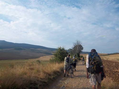 Cam10We put on “street clothes” or “going out clothes”. Really everyone has probably just one shirt, sandals and pants that aren’t fancy quick dry and allows them to fit in with society. I brought a pair of shorts and a girly shirt. I like to look like a girl again in the evenings after sweating all over everything all day. Or, as Brian, our recent hiking buddy from Ireland said it today, “horses sweat, men perspire and women glisten.”  I’m alright with that. My tattoos were glistening in the sunlight all day under the Spanish sun. Spain closes around 2pm and doesn’t open its stores up again until 5. It’s the daily siesta time and is perfect for the life of a peregrino. Spanish people always seem so relaxed.