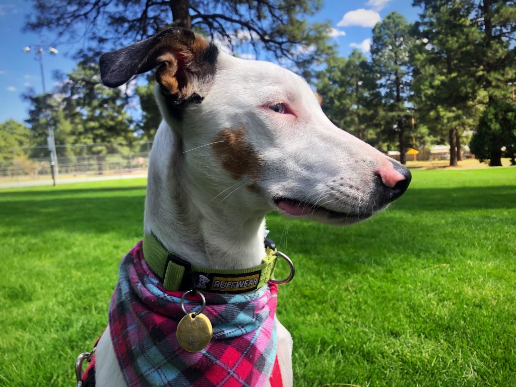 Ellie Roux is actually short for Eleanor Roosevelt, with Roux being a nod to her New Orleans history as a Catahoula, and Roo – because her legs are so long that if you scoop her up on her back, her legs pop out like a baby Kangaroo!