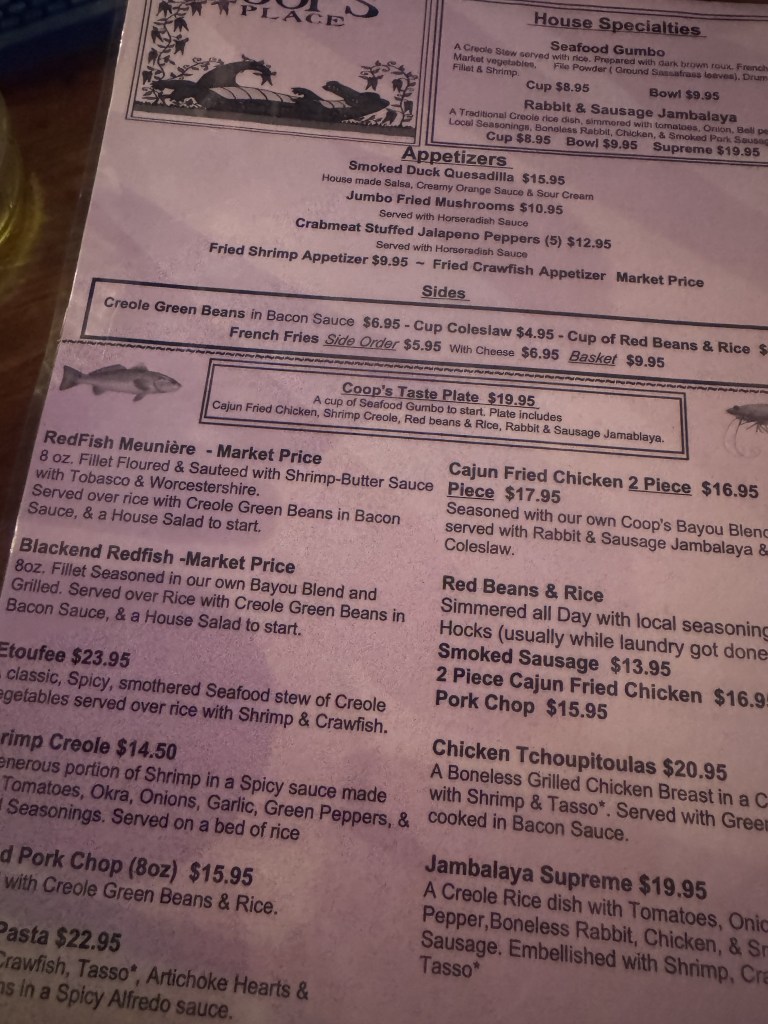 Coop’s Place – One day I wandered into a well known dive bar off the beaten path a bit, but just around the corner from the Hotel Provincial, where I was staying. Not busy on a Monday afternoon, it was cozy but had open bar seating. I ordered the sampler for $19 for a full assortment of all the flavors. It definitely has a little Cajun kick to it! I paired it with a Louisiana beer and listened in on the local chatter, as I dined alone that day. The bartenders were just as opinionated as the reviews say, but were happy to help me with my questions.