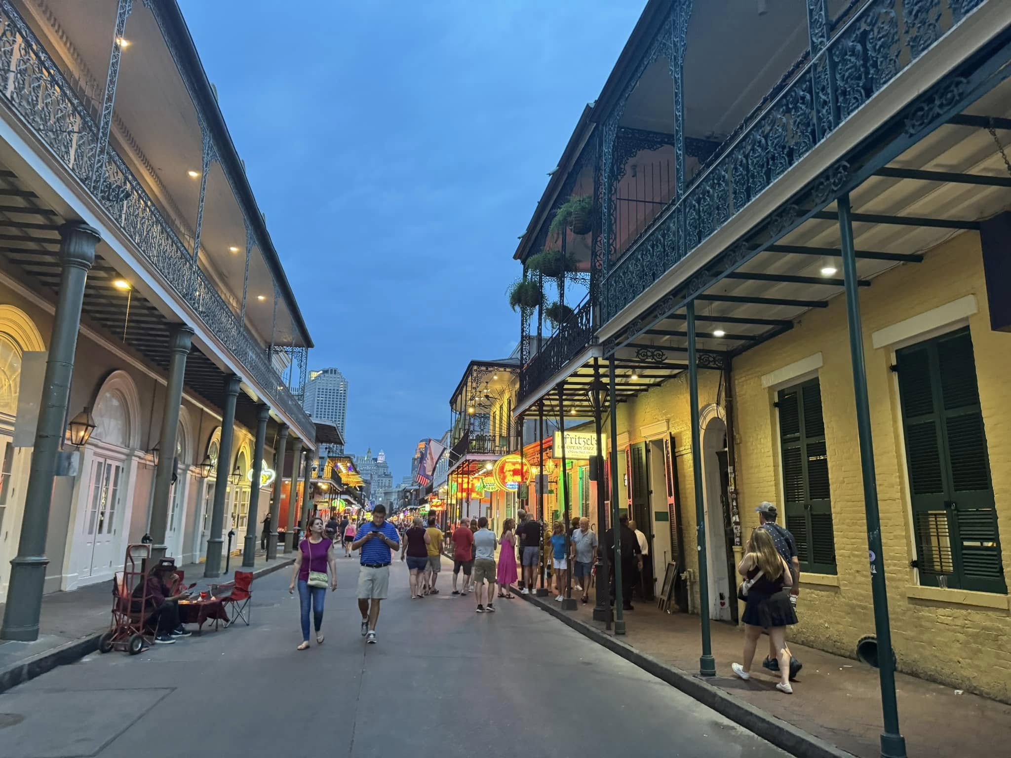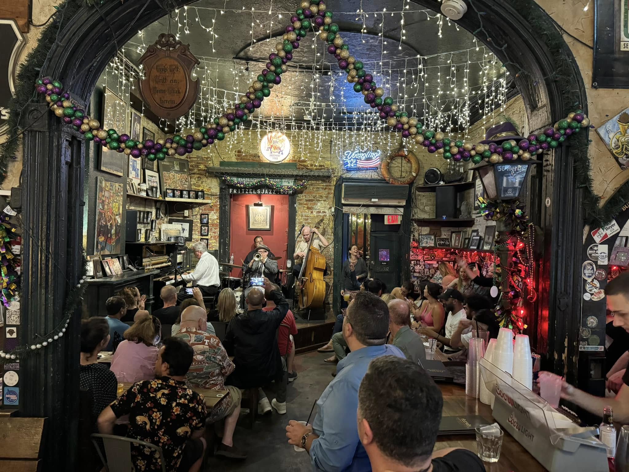 Fritzel’s Jazz – A cozy little nook, tucked away off Bourbon street isn’t very big, but makes full use of its space. You are greeted immediately upon entry and guided to a space where your group will fit, including sharing benches and areas with other folx. I was solo, so I ended up sat right up front next to another couple on a bench by the stage, on a Wednesday night. They save you the awkward searching and asking to share seating, and keep each seat full so everyone has a chance to experience the band. People rotated in and out throughout the evening.